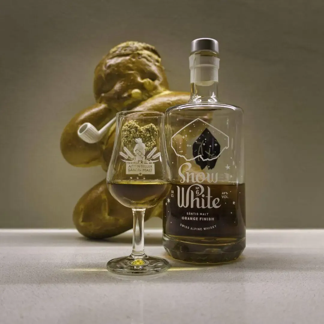 It goes wonderfully with a Säntis Malt Snow White. This time the 6th edition, which was allowed to mature for 5 years in beer barrels and then for another year in French orange liqueur barrels. Already in the nose, the fruity notes of orange, but also apples and pears come through. A little oak comes through. On the palate, the beautiful sweetness and the orange come through strongly, along with spicy notes. The finish is medium long, has the oak impact again, as well as pepper and the sweetness in turn. Cheers!